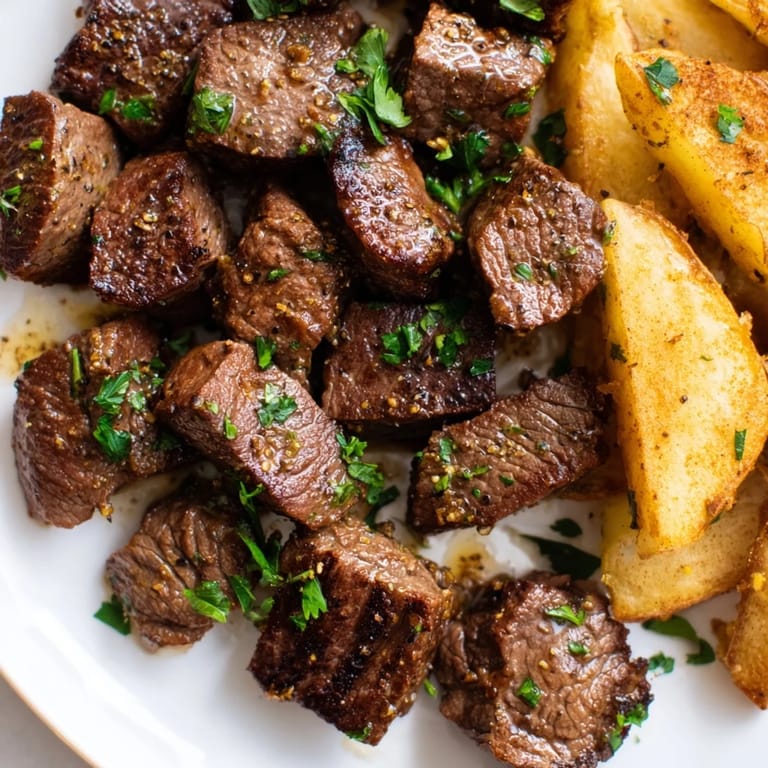 - Serve hot steak bites with crispy fries.