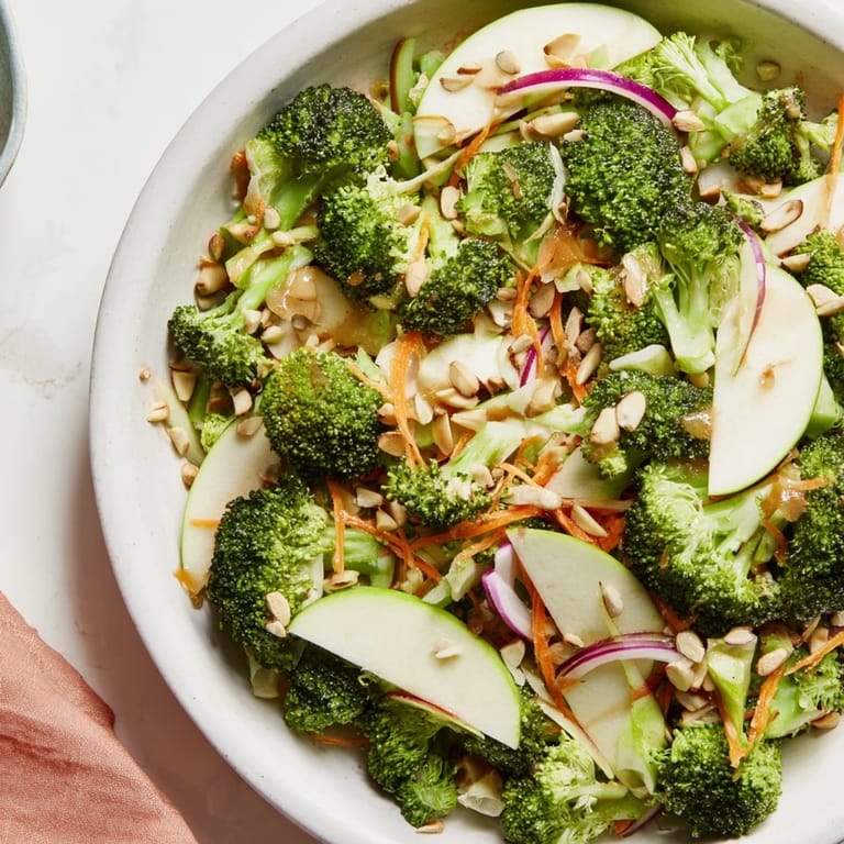 Save A vibrant, fresh salad featuring crisp broccoli and sweet-tart apple, tossed in a zesty dressing for a nutrient-packed, energizing meal.