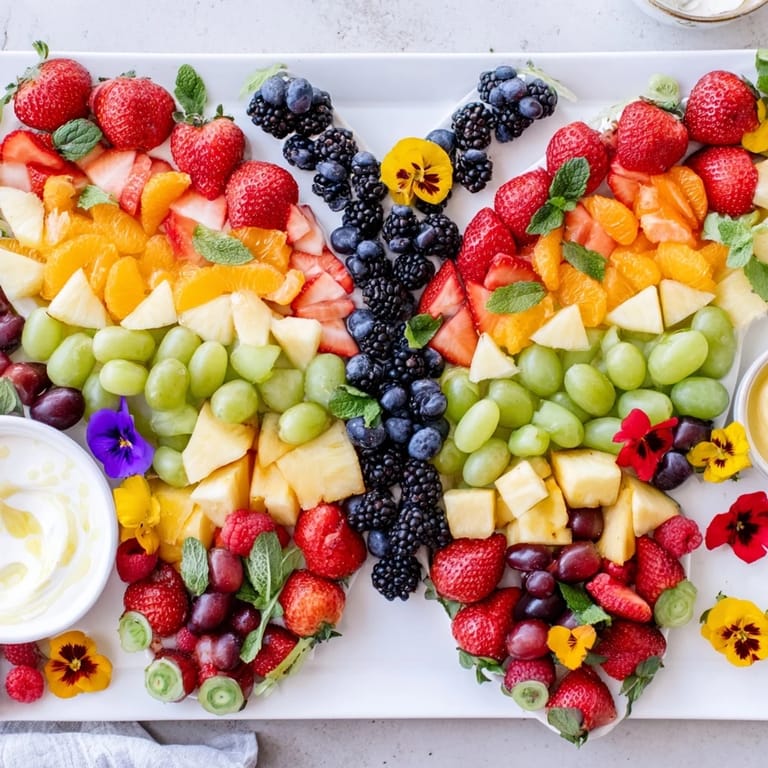 Save A vibrant and whimsical fruit platter arranged in the shape of a butterfly, perfect for spring gatherings, brunches, or childrens parties. Fresh, colorful fruits are paired with creamy yogurt dip and edible flowers to create a stunning, healthy centerpiece.