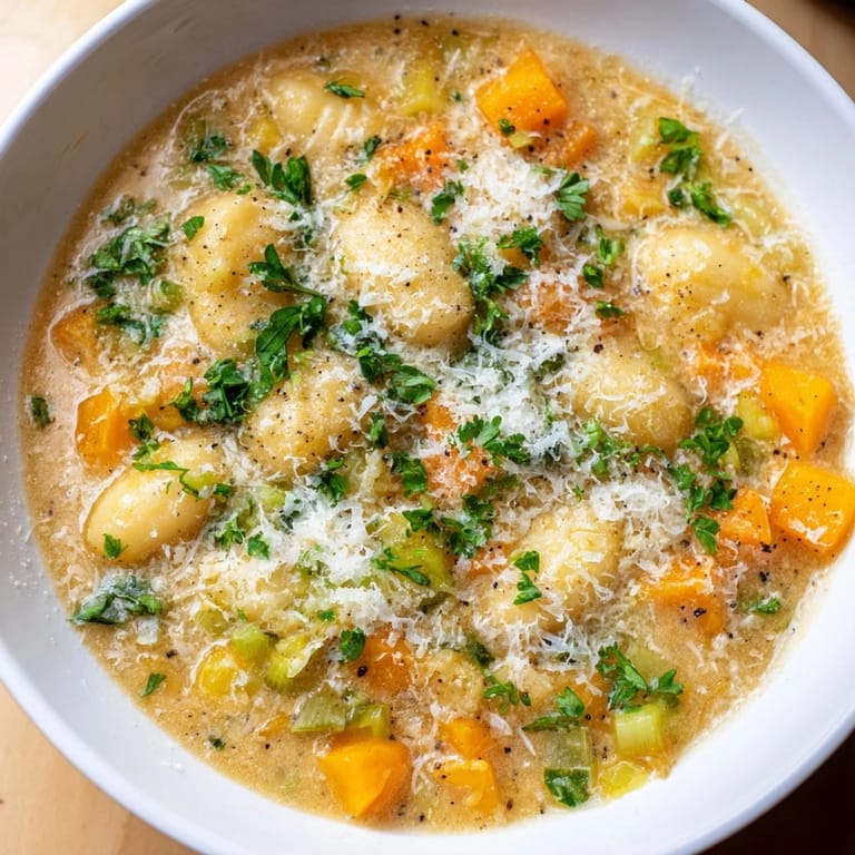 Save A comforting soup featuring pillowy gnocchi, velvety butternut squash, and aromatic herbs in a savory broth—perfect for chilly evenings.
