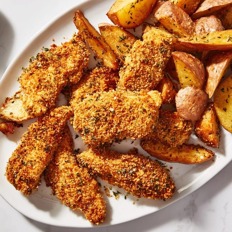 Save Juicy chicken tenders coated in fragrant herbs, served with crispy, golden-brown potato wedges for a wholesome and flavorful meal the whole family will love.