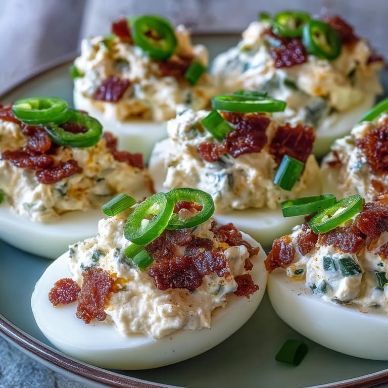 Save The first time a batch of jalapeño popper deviled eggs emerged from my kitchen, I wasn't planning a party—just craving something bright and creamy for lunch. As I mixed together smoky bacon, prickly jalapeños, and that cloud-soft cream cheese, the scent alone made me smile. It felt a little rebellious to take a classic deviled egg and amp it up with heat and cheddar, but every taste test along the way told me this was a risk in the right direction. By the time I slid the finished eggs onto a platter, flecked with chives and flakes of pepper, my kitchen was buzzing with possibility. These eggs have never failed to get people talking and grinning, whether at crowded tables or quiet midday snacks.