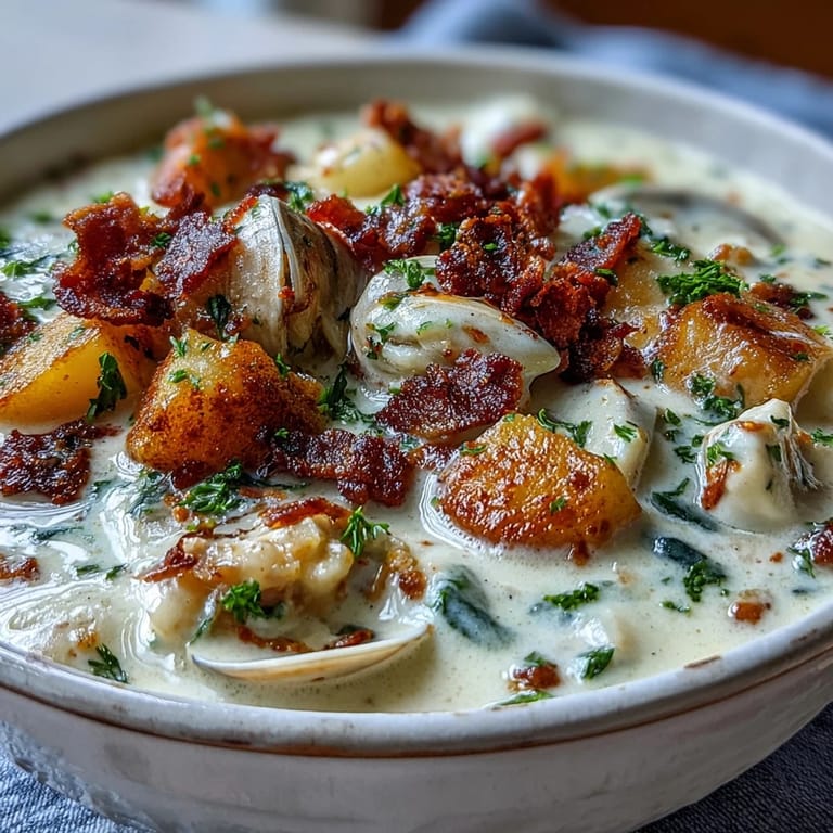 Save There's something about the first sip of New England clam chowder that transports you straight to a weathered dock in Maine, even if you're sitting in your own kitchen. My aunt made this for me one October afternoon, and I watched her hands move with such confidence—dicing potatoes, rendering bacon fat, whisking cream into that golden roux—that I realized this wasn't just a recipe, it was a ritual she'd perfected over decades. The smell alone filled her entire house, creamy and briny and impossibly comforting. I've made it dozens of times since, and it never fails to feel like coming home.