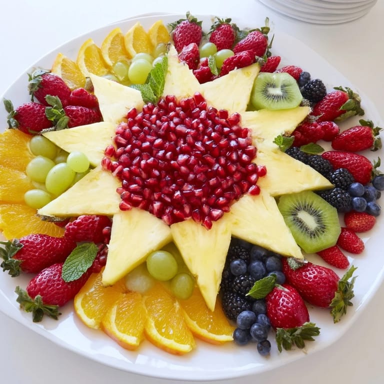 Save A vibrant and eye-catching fruit platter featuring juicy pomegranate arils arranged in a starburst pattern, complemented by a colorful selection of fresh fruits. Perfect as a festive centerpiece or a refreshing, healthy snack.