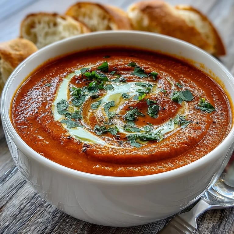 Save This Roasted Red Pepper Soup is a silky, vibrant dish that brings a Mediterranean warmth to your table. By roasting sweet bell peppers until their skins blister and char, you unlock a deep, smoky sweetness that pairs perfectly with the mellow richness of roasted garlic. A bold kick of harissa paste adds a layer of complex heat, making every spoonful a flavorful experience that is both comforting and sophisticated.