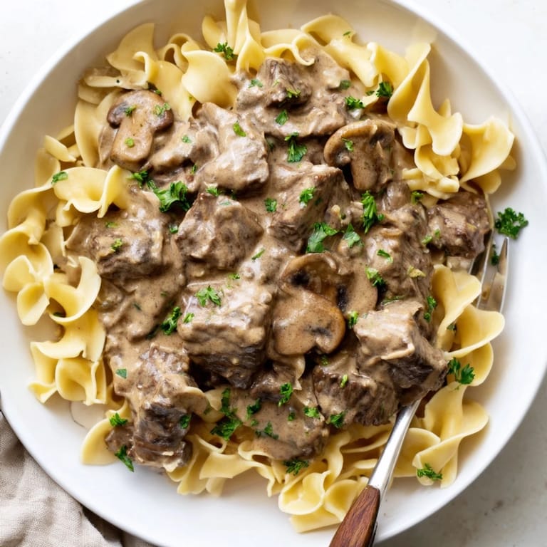 Cooked egg noodles or mashed potatoes complement the creamy beef perfectly, soaking up the flavorful sauce.