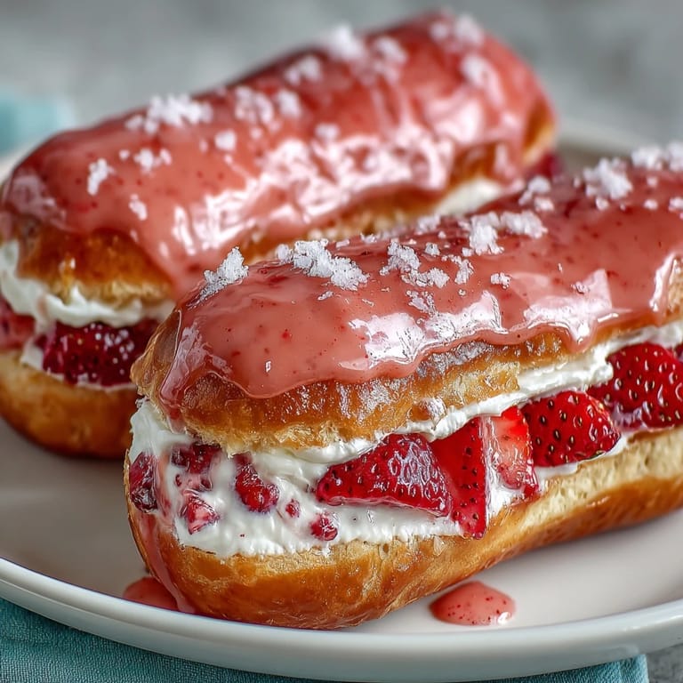 Save Celebrate the season of love with these elegant Valentines Day Strawberry Éclairs. These classic French pastries offer a perfect harmony of light, airy choux shells and a decadent filling of fresh strawberry cream. Each éclair is finished with a glossy pink glaze that captures the essence of a romantic treat, making them an ideal choice for a special celebration or a heartfelt homemade gift.